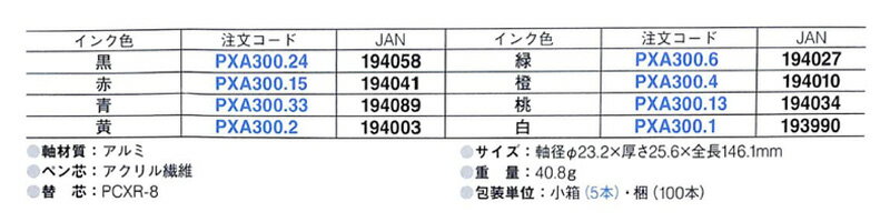 製品仕様 商品名 三菱鉛筆 PXA-300 小箱(5本) 【三菱鉛筆】 内容量 1箱/5本入り 一般名称 ー 色 各色 ご注意事項モニターの発色の具合によって実際のものと色が異なる場合がございます。